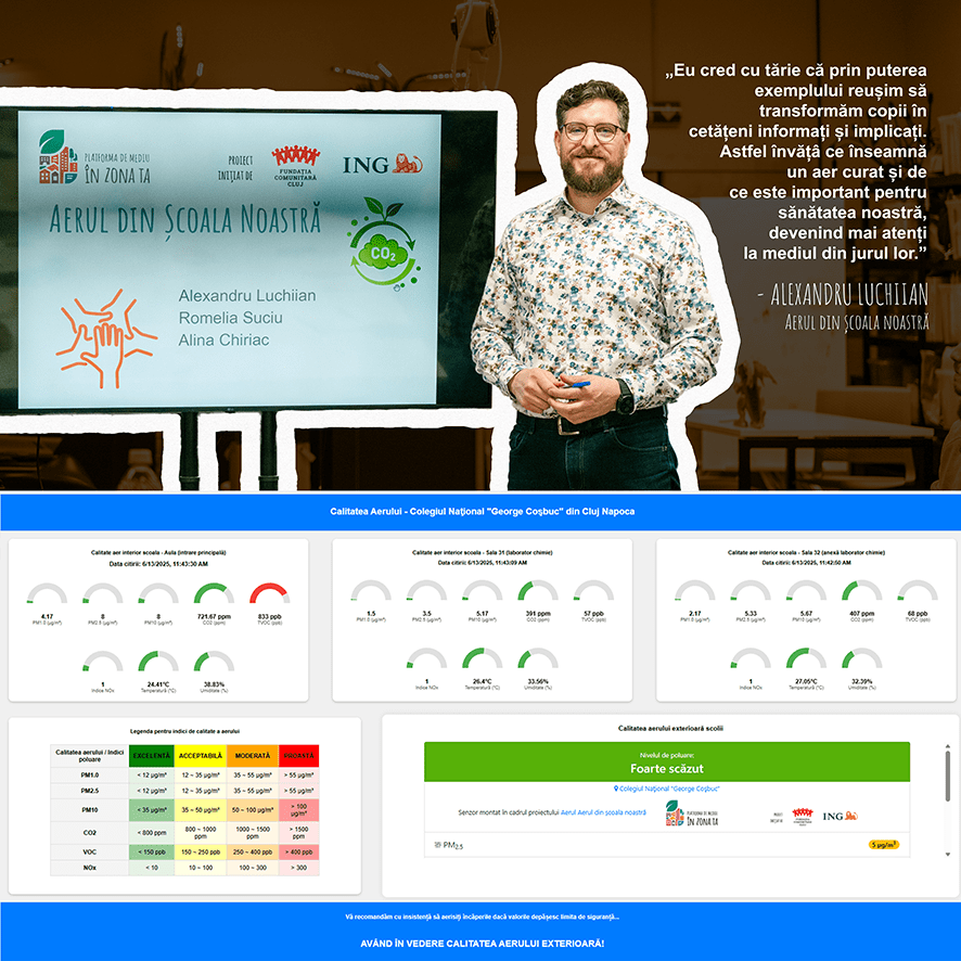 Senzorii instalați măsoară nivelul de poluare și transmit în timp real mesaje clare, precum: „Aerisiți zona”, „Țineți geamul închis”, „Porniți purificatoarele”. Elevii și profesorii primesc astfel sprijin direct pentru un mediu mai sănătos și un proces de învățare mai eficient.